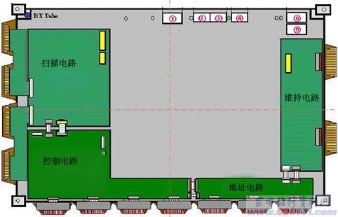 模块的结构和以往的有所不同,整个显示模块从背面看,包括控制电路、扫描与维持电路(Y板)、维持电路(Z板)和下端的地址驱动电路(X板)。X板和Y板通过邦定(bonding)电路,即芯片覆膜,和FPC (Flexible Printed Circuit),即柔性印刷电路,与显示屏相连;扫描驱动IC可以和FPC断开,必要时进行更换。各板之间的数据信号通过扁平排线相连。其中控制电路和左侧的地址电路做在一块PCB上,整个模块的电路分布如下图所示。