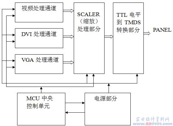 上面的图可以看出:三个通道的信号在进入SCALER芯片之前分别处理,在进入SCALER芯片之后,统一为一路输出,再经过电平转换,输入到后级的PANEL,即PDP模块显示。MCU中央控制单元以及电源部分,贯穿在整个系统中,相对独立,后面的小节中将详细介绍。
