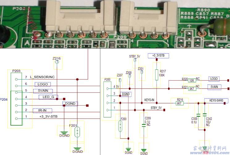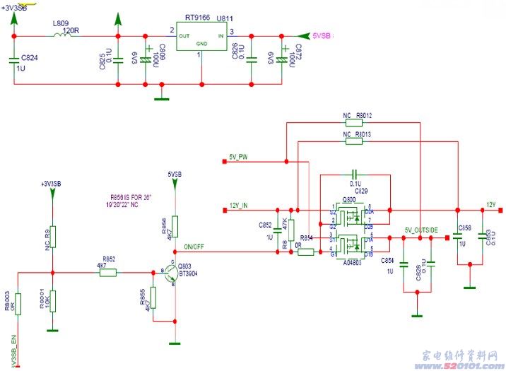 接上电源,电源板提供+5V或+3.3V给主板,此+5V经过U811 DC转DC后输出3V3主要供给小MCU(U810)和按键板,开机时应首先检查。若无,则可能导致不开机和按键错乱等故障。若此电压正常,机器会处于待机状态,指示灯为红色,按遥控器或前控板的节目加减键开机,指示灯闪白色,此时CPU通过I/O口发出一个开机使能信号(3V3SB_EN),使三极管Q803导通,Q816截至,使Q800开关管导通,电源板输出+12V和背光的+24V供电,但此时屏的背光不亮,待主程序完全跑起来后,主板给屏发出一个使能信号,背光控制开关BL ON\OFF打开((P800的PIN1有大概2.1V左右的电压),背光亮,开机成功。待机是由U810的第11脚发出一个+3.3V的高电平至P805的第4脚控制待机,此时红灯亮;而开机则是由主IC U203的第216脚发出一个+3.3V的高电平至P805的第5脚,此时白灯亮。