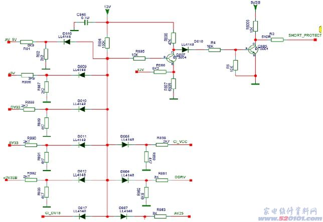 保护电路如下图所示。低电位保护,正常工作时,Q807导通Q805截至,R2处有+2.45v电压;当检测到AV_5V,+5V,DV33,AV33,+3V3SB,2.5v,1.8v电压降低时,Q807基级电压被拉低而截至,Q805由于基级电压升高而导通,使C级电压被拉低而使机器进入保护状态。