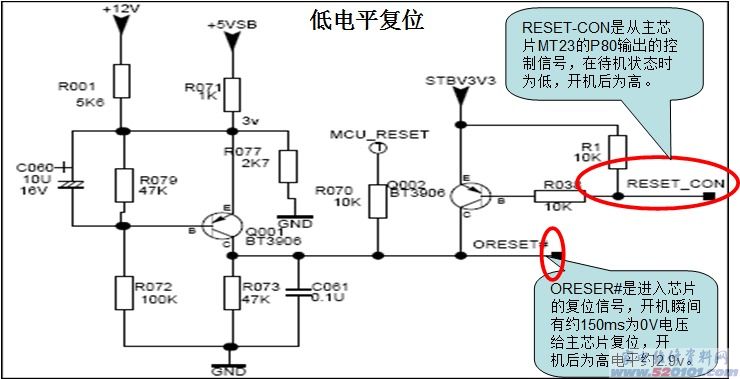 1:开机时,Q001通过C060,R072充电导通。C极电平为低约150ms时间,充满后截止,C极电平为高(设置为待机开机复位过程与POWER ON 复位相同)。