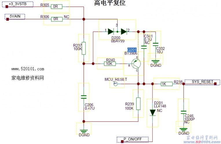 开机时:5V对C206充电。这时Q201导通,U200的P1脚位高电平,机器复位。由于R237远大于R240,所以C206主要通过Q201的BE极导通充电。