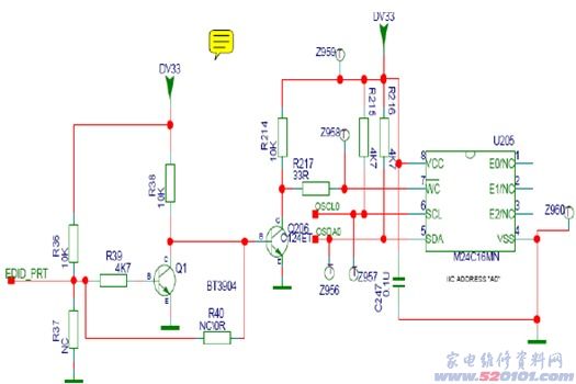 集成块16K EEPROMM24C16系统记忆IC,里面装了一些工厂和用户设置的参数,HDMI的KEY也需通过预抄写于此。当EDID_PRT为高电平时,三极管Q206导通,从而使IC U205的PIN7为低电平,这时数据可以由MT5335内置的MCU通过I2C口写入U205中。