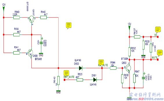 开关机静音 :开机时,12V通过R639为C602充电,在充电的同时12V通过R643使Q607导通,Q608截至,此时HW_MUTE输出一个高电平至U600而完成开机静音;关机时,通过C602的放电而使Q608导通,Q607截至,此时HW_MUTE输出一个高电平至U600而完成关机静音。利用开关机给C602充放电这段时间,HW_MUTE输出一个时间比较短的高电平使U600完成静音,以消除开关机时的噗噗声。 按键静音:按键静音控制信号,高电平静音,按静音键时有+3.3V电压。
