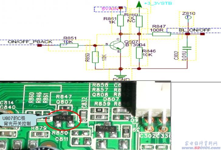 通过软件控制改变主解码的P132脚输出高低电平,来控制Q807的工作状态。从而控制背光的开关。