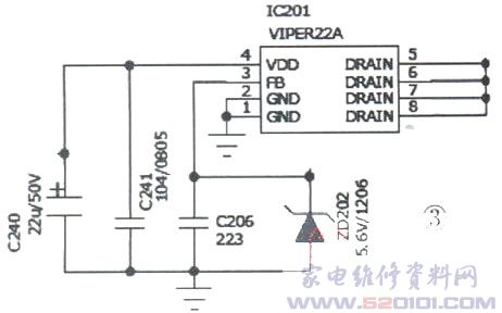 分析与检修:开机测试发现,5V待机电压只有3V左右。说明问题在5V电压产生电路。根据故障维修流程,首先测试桥堆的输出电压为300V,正常,怀疑是稳压电路有问题引起的。检测稳压电路元件,没有发现异常。尝试代换稳压电路的易损元件后开机测试,故障依旧。通过对比检测5V待机电路IC201各个引脚的电压(见图3),发现④脚的VDD电压比正常的20V电压低几伏。因此怀疑是IC有问题,代换IC201后再次测试,电压还是低。于是检测IC201的外围元件,发现C240开路。更换C240后测试,故障排除(见图3)。