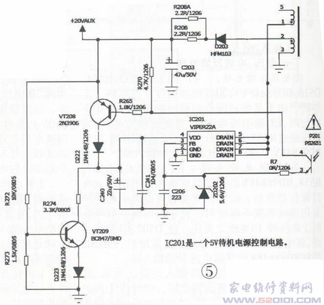 分析与检修:开机测试发现,在不接负载时5v电压低,接负载后就没有了电压。因此可以判断问题出在5V电压形成电路。按检修流程,首先测试桥堆输出的320V电压,没有问题。测试IC201各个引脚的电压并进行对比(见图5),发现IC201的④脚电压只有十几伏,而正常的机器有20V。怀疑是IC201损坏,代换后测试,还是不行。于是检测IC201的外围电路,发现VT208的e极电压有22V,进一步检测发现D222开路,造成维持电压没有加到IC201的第④脚VDD脚,造成了没有5V电压。更换后测试,故障排除。