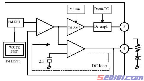 英文注释:FM DET调频检波;FM AMP调频放大器;DE-emph伴音去加重;DC loop直流回路