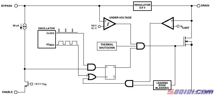 英文注释:OSCILLATOR振荡器,THERMAL SHUTDOWN热保护,UNDER-VOLTAGE欠压保护,REGULATOR稳压器,LEADING EDGE BLANKING消峰抑制电路,