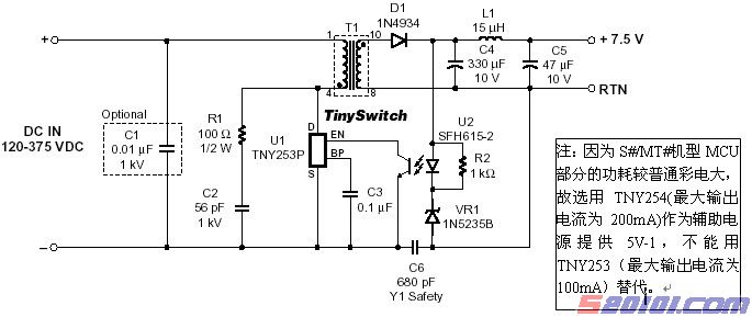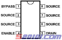 引脚功能:(1)BYPASS(BP)旁路脚:内部5.8V稳压器通过对该脚外接旁路电容进行充放电,实现对IC的低功耗控制;(4)ENABLE(EN)驱动脚:该脚电压的大小可对IC进行稳压控制,此脚电压升高,则(5)脚输出的脉冲占空比增加,变压器次级整流后的电压也升高;(5)DRAIN(D)漏极脚: