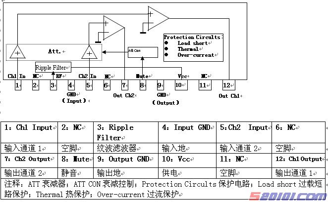 该伴音IC外形采用12脚塑装,应用于低频放大,内置10W音频放大器,具有静音和保护功能。没有设置重低音的MT机型采用此IC,如MT2928,MT3418,还有部分MT2975机型。