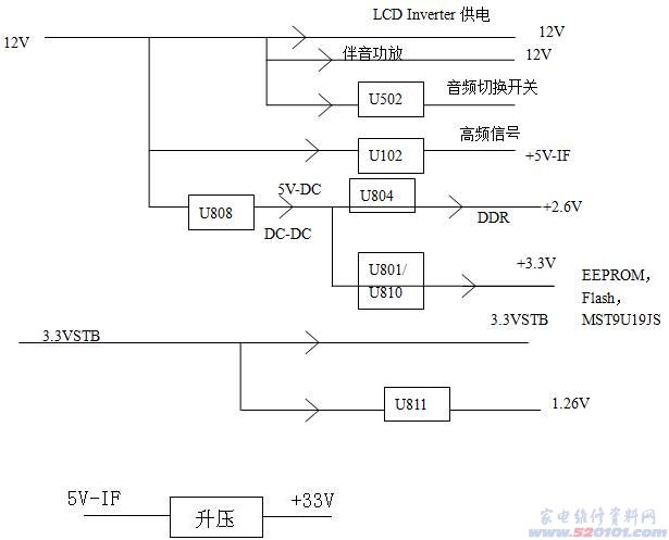 它采用的集成电路分别为:U807:RT8110(DC转DC控制器,5V电压输出)、U804:LD1117S33(5V转2.6V供给DDR的电压)、U603:TDA1517ATW(伴音功率放大器)、U201:MST9U19JS(数字视频解码,液晶显示处理器,微处理器)、U202:EN25F80-100/PMC25L080(Flash存储器,存储CPU程序)、U203:M24C04MN(存储器)、U204:M24C32MN(EEPROM 存储菜单信息)、U502:HEF40528(音频切换开关)。