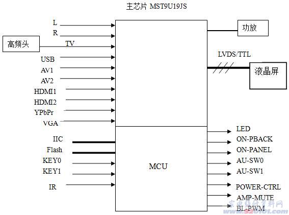 两路AV输入,一路VGA输入,一路YPbPr输入,输入的信号经外接电阻,电容滤波,隔离后由MST9U19JS的17~26、34~38脚输入这些信号。输入的这些外部信号经MST9U19JS内部进行信号开关选择,自动化RGB/YCbCr模数转换输入,视频解码,色度解调,缩放引擎,Gamma校正等,最后送到显示屏进行显示处理。