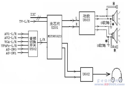 经高频信号处理后的TV信号,由排插P507的4脚输出TV视频信号,P507的1,2脚输出左,右声道音频信号。TV-VIN+信号输入到MST9U19JS的34脚输入。TV-LIN,TV-RIN分别输入到MST9U19JS的62,63脚输入。
