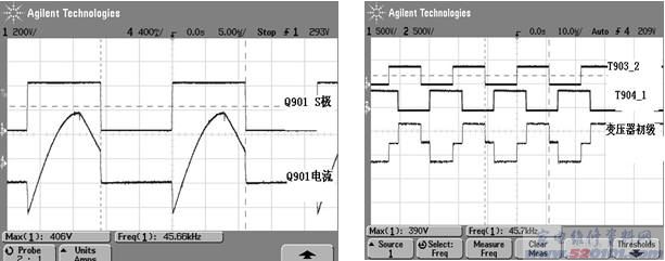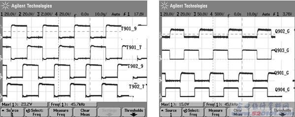 U901输出的LDR1电压VPP幅度只有5V,通过Q914的电平变换(电压放大器),输出24V的驱动信号,经Q906、Q912的推挽放大驱动变压器T902,经T902隔离后驱动Q903。其中Q918的作用是为缩短Q903的电压上升沿时间,降低损耗。