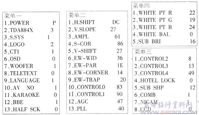 菜单三有三项工厂设置项,但正常数据与故障机一致,应该没问题。继续按节目减键将光标移至菜单四。