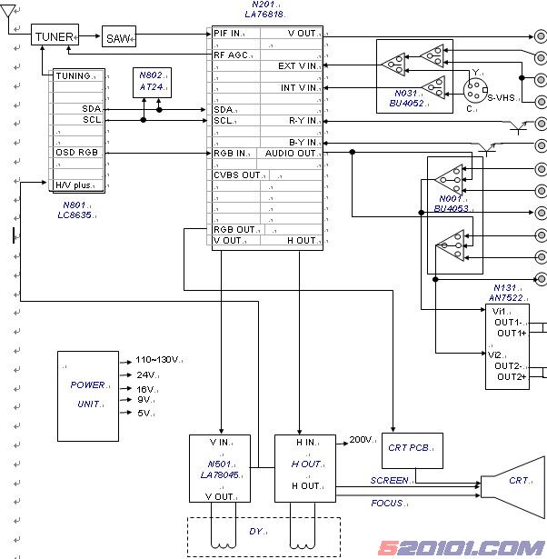 本机芯采用三洋I2C总线控制的主芯片LA76818,该芯片内部集成以下电路:中频放大检波、AFC、伴音中频解调、亮度延迟线、色度信号滤波解调、行场小信号处理。该机芯除+B(B1)电压由电位器调节外,其余均由CPU通过总线控制。