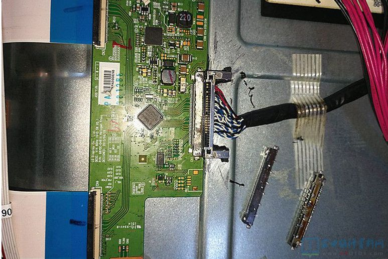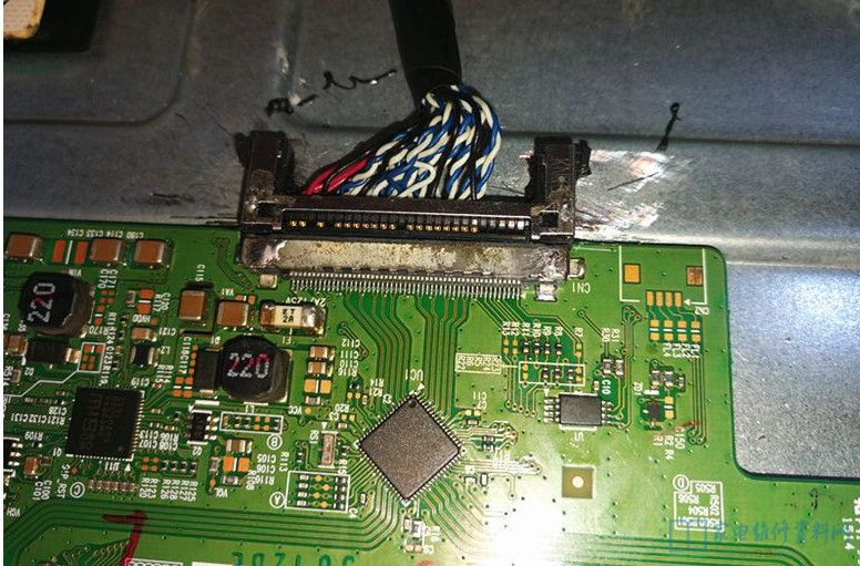 打开电源,此时屏幕竟然出现亮丽的开机画面,大大出乎我的意料,用手拨动逻辑板屏线插头(这个部位是我修液晶电视机花屏故障最喜欢摸的),屏幕上跟随有反应,想不到看似多么难啃的骨头竟然是这么简单的接触不良故障,呵呵,我心里一下子激动起来了,想想这五百多块(和用户商量好这个价钱的)就有些兴奋。可是看似简单的事情就此拉开了这一次探索性维修,挑战着我这半桶水智力和毅力的极限;