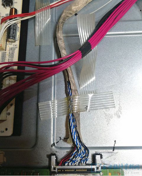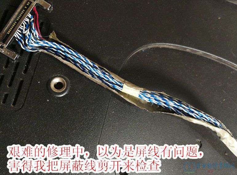 因为时间关系,艰难的检修过程在此就不叙述了。直接挑明原因,经过艰难的探索才发现,造成这种故障的原因是:屏线上的金属屏蔽了线没有良好的接地,致使屏蔽线与屏铁体摩擦产生的干扰信号干扰了逻辑板正常工作,所以出现了图片上的现象。厂家意图是通过胶带来把屏蔽线压在铁壳上,以此来完成屏蔽线的接地工作,没有考虑到屏蔽线氧化产生接触不良的后果。在我修之前厂家的师傅也认为是逻辑板的事情,所以直接换了逻辑板以为就了事了。