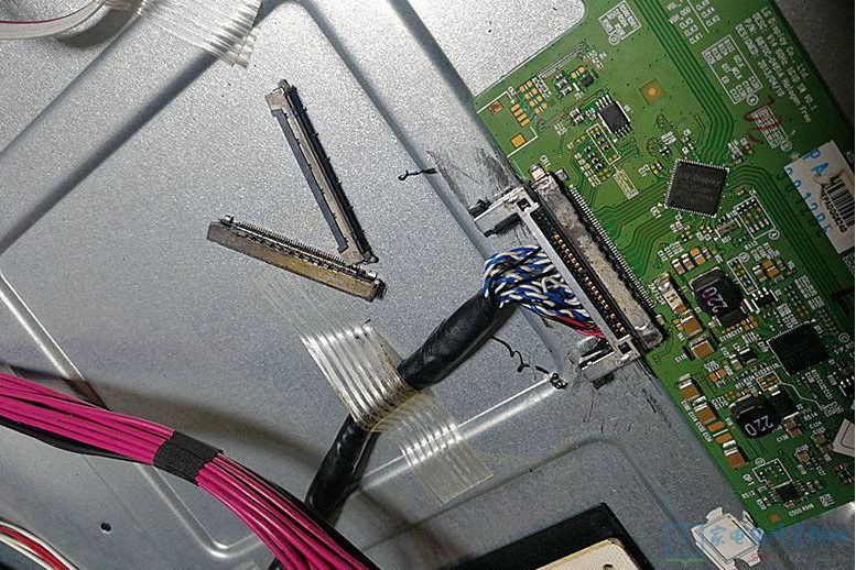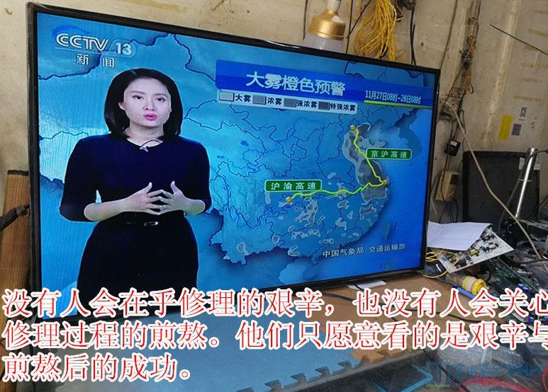 做修理的人一看故障现象都知道,这是屏幕问题。我把电视机拉回到店里之后,也是打算把它送给修屏的师父修的,因为我没有修屏的条件,就算不是修屏,凭我这半桶水的功夫,恐怕也啃不动这块硬骨头。