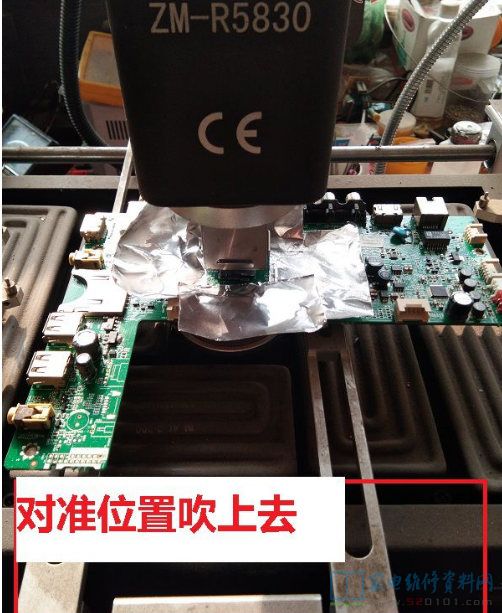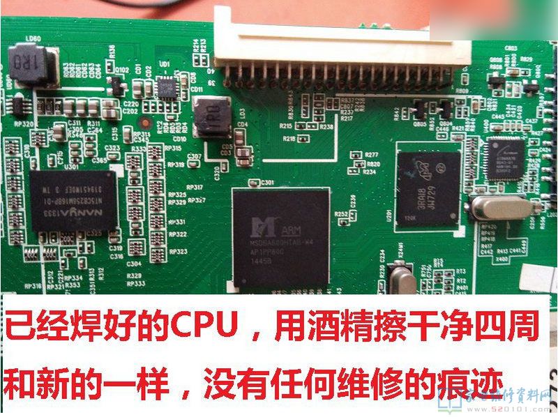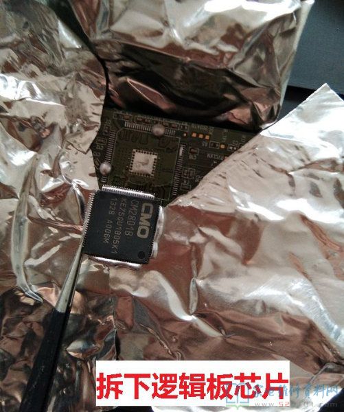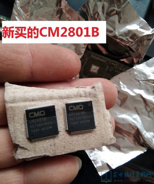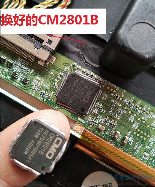 维修的注意了,更换CM2801B用的热风枪,芯片背面有焊盘,不用风枪下不来,但是芯片和COF排线离得太近,又怕把COF吹得脱焊了,所以用铝箔胶带把芯片周围贴上,以最快的速度拆下CM2801B,用了这个方法,换了两次COF还是没有脱焊。
