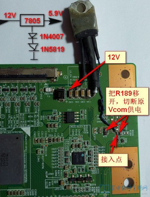 再等机器冷却后再开机,测得冷机正常时,Vcom电压为5.86V,继续监测,发现随着时间的延长,该点电压逐渐下降,5分钟后电压跌到5.1V,查后级无明显不良器件,怀疑IC5 (11991/H524985)Vcom电压部分不良。