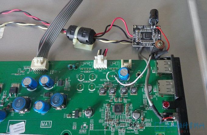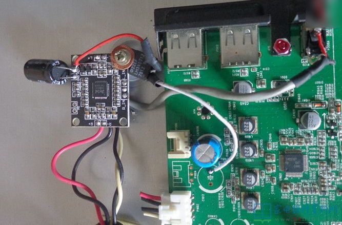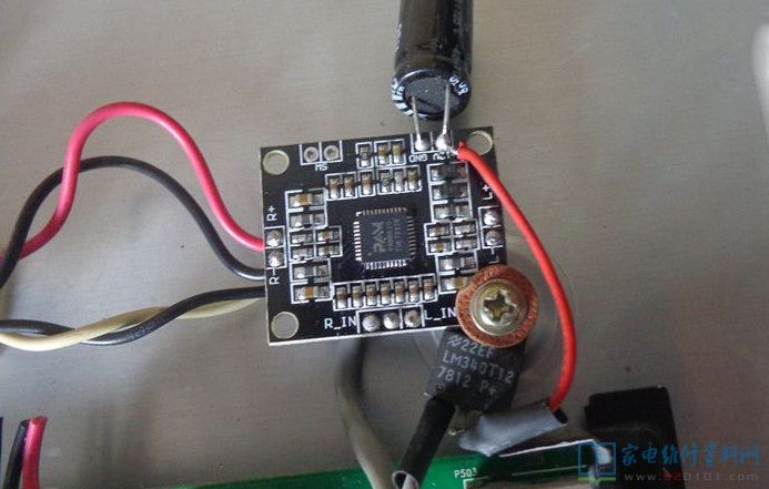 沉思间一眼瞅见功放附近有一个音频输出插座,3.5MM双声道,打开示波器测得有音频信号,换其他信号源包括高清口,都有信号输出。立即动手,原功放供电24V偏高,串一个7812,把电压降为12V,输入信号直接取自音频输出插座,接好喇叭通电声音洪亮。唯一不足的是本机音量失去控制,但在数字电视,网络电视以及卫星电视普及的今天,各种机顶盒都自带音量控制,所以不是个问题,这个方法介绍给网友,遇到疑似数字功放坏,可以这样改。