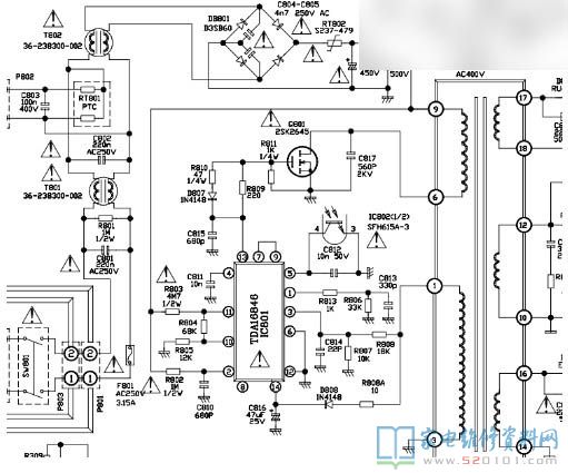 可是客户拿去大概半小时又送过来说故障依旧。重新拿回店子里开机还是正常,于是还是开盖检查,没发现任何问题。必须带上机器上门检查了,确定交流电插座正常且没有接触不良问题后,正好遇上问题出来,开盖检测,发现客户那里的220V有238V,导致机内300V高达330V,于是认定是过压保护了。经查,电源IC10脚是经过4.7M电阻接300V的,查资料,当10脚电压超过1.2V伏IC就会保护。