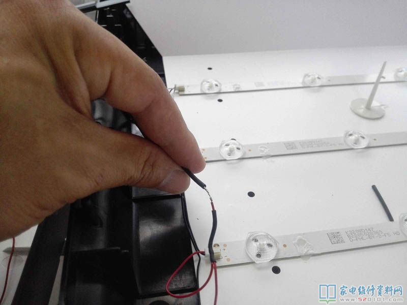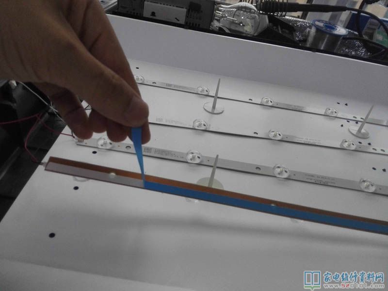 开始更换新买的灯条,因为只有4根,不能和原来一样用螺丝固定了,所以直接把灯条背面的耐高温双面胶撕开,粘在底板上就行了。