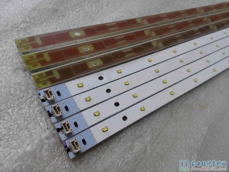 把固定灯条的螺丝拧下,拆下7根灯条。这些灯条基板都是纤维板的,散热不好,寿命也不会太长。