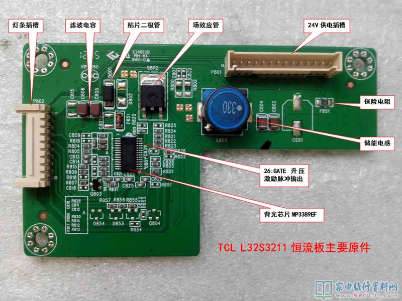 前面这两项都正常,那就是灯条的问题了。为什么呢?这还要说一下恒流板的工作原理。本机恒流板采用的是MP3389EF背光芯片,内含振荡器,26脚输出方波脉冲,使开关管工作在开关状态。 24V通过保险电阻、储能电感,一路去往灯条插槽,一路去往开关管的D极。开关管G极接高电平时导通,S极经电流检测电阻接地,流经储能电感电流增加,储能电感储存能量;开关管G极接低电平截至时,储能电感储存的能量与电源电压24V相叠加再通过滤波电容滤波获得稳定的LED高压供电能源。