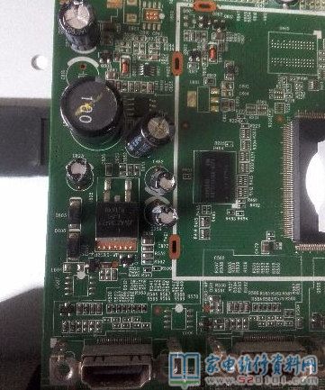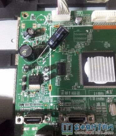 奇怪的是,开机24v就启动,测开机开机信号就高电平,背光控制没有电压,屏电压也没开启。测背光控制电路没有短路。难道是主板坏了?测3.3V,1.8V,1.2V都有。思考片刻,想着是不是要开机热机了就正常?就用加热法果然找到真凶。就是下面的图片里,长引脚的这个电容,原本330uF下降至220uF,换了个470uF的电容上去之后,把机器静置冷却开机正常,播放半天晚上冷却第二天开机正常,机器修复。