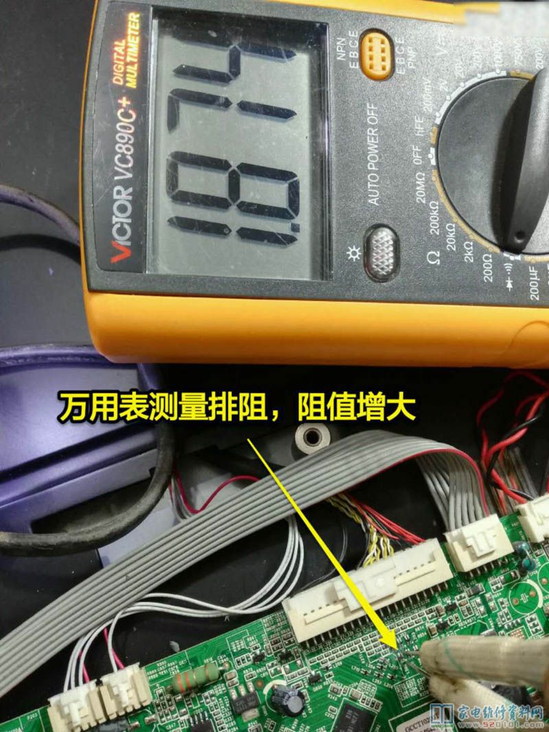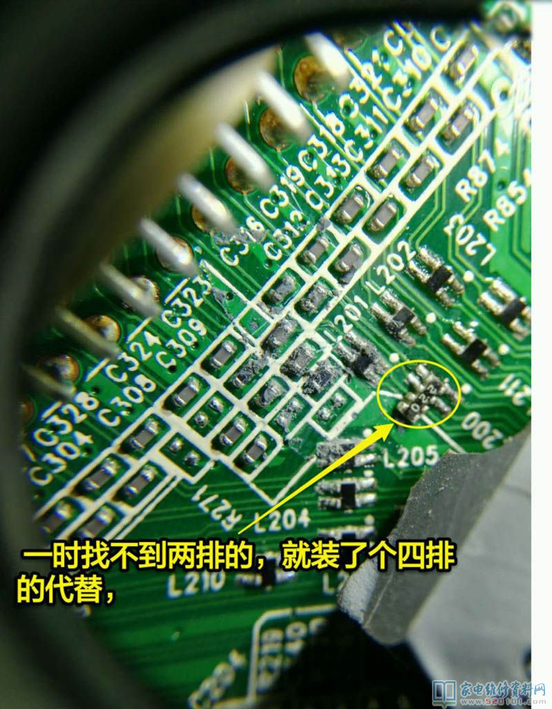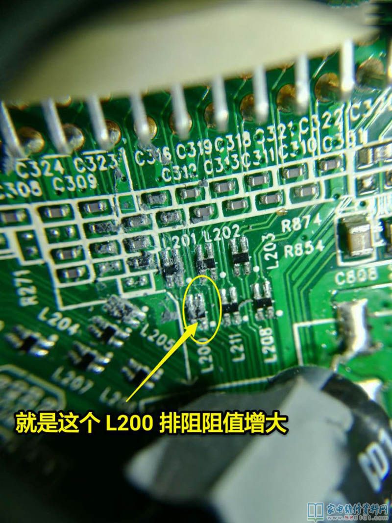 将机器拿回店里进行拆机检测,各路电压基本正常,因为是偶尔花屏,心里判断为哪个原件性能不良所致,既然同行朋友屏线换了逻辑板也大致查了,心想会不会是主板引起的花屏?由于天冷拆屏修逻辑板感觉还是有些麻烦,那就先检查主板吧,根据故障现象,首先检查LVDS信号,测量各个信号输出排阻,当测量了L200时阻值明显不一样(如下图所示)。此时心里已经无比激动了,因为这就是花屏的罪魁祸首。随即,从旧主板上拆了个,装机再试机,图像清晰花屏故障排除。
