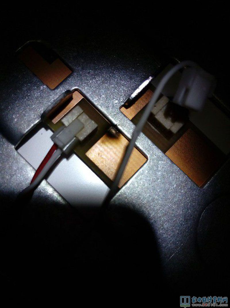 指示灯亮,翻动机器时机内呲呲作响,屏幕满屏竖直条纹,立即关机。才想起客户说过息屏时有滋滋声。再开盖,循声详细检查,见一灯条连接线与金属机壳相碰打火。用绝缘胶带隔离,连接线移位处理。观察塑料背盖有一凸起点,遂把压住线的部分切除掉,以绝后患,观察另一边同样,也切除之。装机试机无异常,交付给客户。