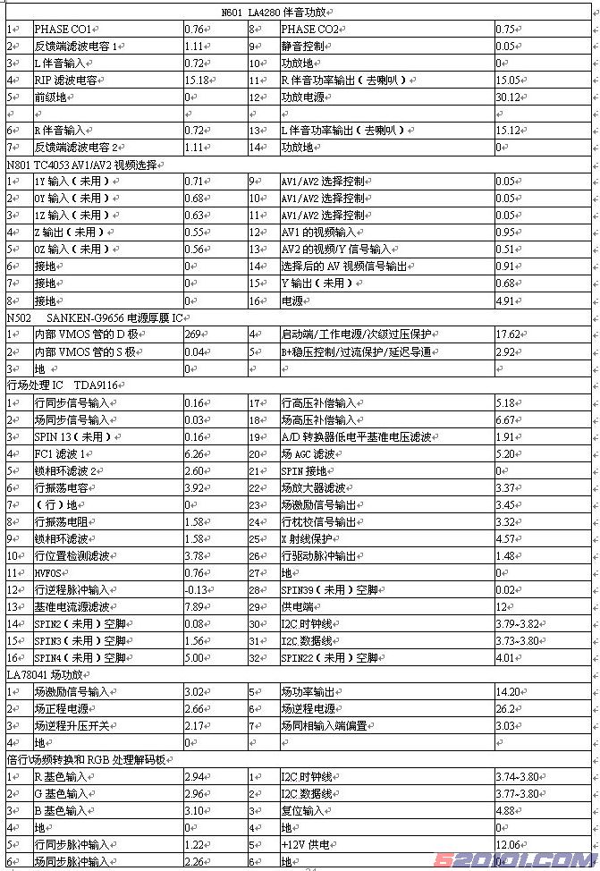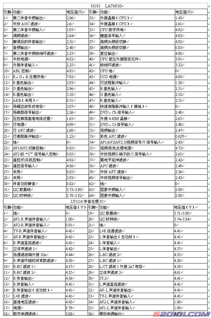 从高频头输出的IF信号,经预中放级V102放大,减少插入声表面滤波器Z101的损耗,如果有故障会使图象灵敏度降低,图象噪波点多,中频信号经Z101输入到N101 LA76930(63)(64)脚进行中放解调,中放部分内有一个锁相环压控振荡器VCO受软件控制其中心频率,VCO的基准参考频率由N101(50)脚外接4.43M晶振分频后产生,VCO产生的信号在同步检波器内与输入的中频IF信号进行同步检波,得到全电视信号,经中放AGC控制/伴音陷波器从N101(60)脚输出,其中要注意N101(56)脚的锁相环误差电压滤波电路和(59)脚的中放AFT滤波,该两脚有故障均会造成图象信号轻微失谐或者找台时漏台(AFT滤波),严重时没有信号,而N101(2)脚中放AGC滤波,(61)脚高放延迟AGC输出有故障,则会造成灵敏度低/图扭/无信号/漏台等故障。