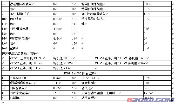 待机状态下由N101(25)脚输出低电平,V551导通,+5V经V551ec极,R561使V552导通,由R529,VD528组成的待机控制支路,经V552ce极到地,待机控制电路起作用,VD528(6.8V)的稳压管反向击穿,N501的发光二极管发光量加大,热地部分N502⑤脚的电压上升,开关管导通时间下降,次级B+等供电电压下降,当C564的电压下降到低于VD528的反向击穿电压(6.8V),光耦N501的发光二极管发光量下降,N502⑤脚的电压也随之下降,开关电源重新进入强振荡(导通时间较长)的工作状态,重新对次级各滤波充电,当C564的电压升到VD528的反向击穿电压,N501的发光二极管发光量又加大,N502又进入弱振荡状态,如此循环,待机对次级的各供电电压比正常开机都要下降许多,电压下降的大小主要有C564,R525,R529,VD528的参数决定,正常开机收看状态,N101(25)脚输出高电平,V551,V552均截止,待机控制支路不起作用,需要指出的是:N101,LA76930,CPU部分的供电电压由三端稳压器N552提供+5V的稳定电压,不管是开机或待机状态,该电压都不能有波动(实际有微小的波动),否则CPU的工作状态将不正常(主要是复位电路误动作引起)。[Page]