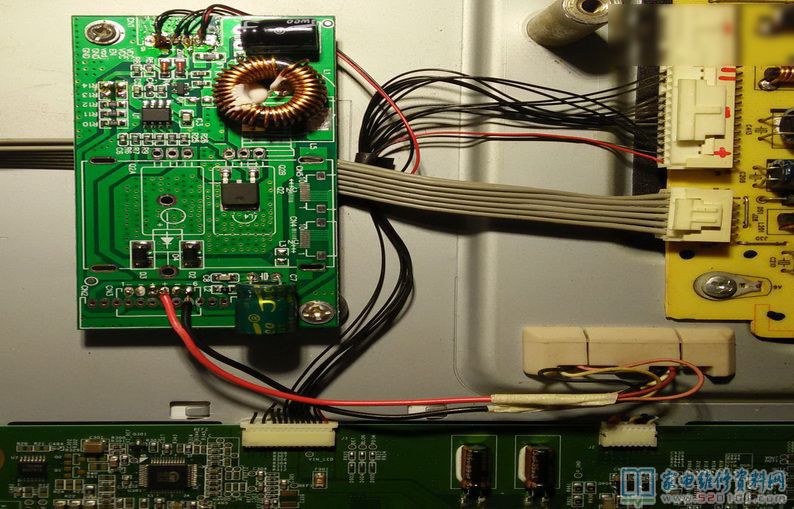 考虑修复背光驱动电路比较麻烦,并且可靠性也不一定高,还不如购买现成的驱动电路板。几天后,货到了,只有电路板,没有连接线。剪断原来的24V供电、G、DIM、ADJ几根线,焊接到新板上,又将4组灯条并联接到电压输出端,通电开机,测量灯条电压为55V,电流为350mA。焊下一只1Ω的限流电阻,测量电流为200mA,不知道原来灯条的电流是多少,但是电流小一点应该耐用一些,观察图像的亮度还比较满意。
