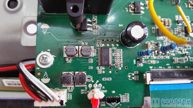 接修一台TCL LE32E2900液晶电视无伴音,据客户描述,在收看过程中因为要接听电话所以调至静音,等接完电话再恢复音量的时候发现电视机没有声音了。调了总线故障不变,怀疑硬件故障,此机伴音块为TPA3110LD2,15和16脚供电12V正常,1脚静音脚电压为1.1V(不正常,正常应为2.5V左右),怀疑静音控制电路异常,因为找不到电路图决定改电路维修,断掉静音电路,用180欧电阻把1脚直接接到3.3V供电上,试机声音恢复正常。