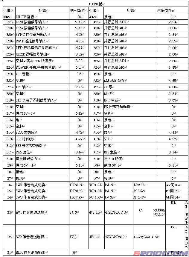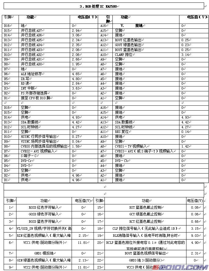 从天线接收到的射频信号进入一体化高频头调谐器(内含高频与中放电路),高频调谐器受MCU N801的指令(SDA,SCL,SW1,SW2,SW3)控制,其中SDA,SCL两根线负责频段、搜台调谐、信号微调,SW1、SW2、SW3负责制式切换。经高频头及中放解调后输出2Vp-p的视频信号和1Vp-p的音频信号,视频信号经V101、V103两级射随放大后,R111、R112电阻分压成幅度为0.7Vp-p的视频信号送到DPTV-MV进行数字解码、变频处理,AV接口的视频输入信号经匹配电阻后也直接送到DPTV-MV。在DPTV-MV内进行视频开关选择输入的信号、模数转换、数字解码、图像缩放、动态图像画质增强处理(亮度动态瞬时改善、动态色度瞬时改善、动态扫描速度调制、动态黑电平扩展、动态自适应平滑滤波、动态白电平限制、动态肤色校正处理等)、OSD叠加、数模转换,最后输出0.7Vp-p的RGB信号进入RGB处理IC N601(KA2500)(5)(8)(10)脚,经过内部的电路对RGB进行对比度、亮度、白平衡调整。由行包(8)脚和R313、C330、R330、C315、R320、R610、VD605、R608、C610、R609组成的ABL控制信号送到KA2500的(12)脚,实现对输出的RGB信号亮度、对比度自动调整,避免高亮度的图像内容使CRT的束流过大、图像发糊,高压下降太多而使行场幅度不稳定。从KA2500(19)脚输入的是行场逆程的消隐脉冲和开机/转台消隐脉冲(由MCU组件的(1)脚输出),如果该脚一直处于低电平则内部的RGB通道均处于消隐状态,RGB输出的电压下降为0.68V左右,没有正常的光栅显示,(18)脚时箝位脉冲的输入端,没有该脉冲输入到(18)脚(由解码板X102 A10端输出箝位脉冲)也会没有光栅显示。从KA2500(21)(24)(26)输出的RGB基色信号经V601、V602、V603三个射随放大器提高电流驱动能力后,送到CRT三基色视放IC TDA6111Q放大,驱动CRT的RGB三个阴极,在行场偏转的磁场作用下,形成图像。RGB基色信号从TDA6111Q的(3)脚反相输入端输入,该脚的直流电压升高,(8)脚的直流电位将变低,图像将越亮,而三个视放IC的(1)脚经R430、R431组成的分压器得到一个固定的直流电压3.9V加到其同相输入端作为偏置电压,该电压值的大小将决定图像的亮暗程度,IC的(7)脚是信号的高频瞬态输出,经560P的电容耦合送到CRT的阴极,该脚没有信号输出将会使彩色出现轻微的拖尾或亮度信号的高频分量丢失,使图像较为模糊,(9)脚是输出的反馈信号经电阻R406(51K)反馈回(3)脚,决定放大IC的电压增益和稳定IC输出的直流工作点电压,R406开路将导致TDA6111Q不工作,造成缺色。 [Page]