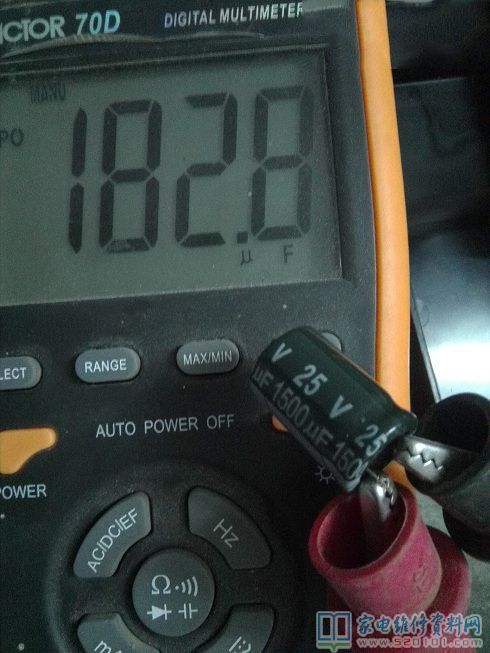 外表完好的电容,容量却大大的减少,这就是引起故障的原因?由于找不到相同的电容,只找到一个25V/650UF的代换,换上之后,电视机一切正常了。