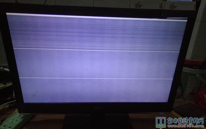 今天说一例很奇特的故障,一台乐华24寸液晶电视,这台电视的故障是图像显示不正常,屏幕不断的闪烁,闪烁的同时那些白条也跟着闪,如下图所示,当你第一眼看到这个故障现象时,你第一时间反应的是什么?那不用说了,肯定是屏,逻辑板,对吧?我也是这么想的。当然,客户也是这么想的,认为故障是复杂的。