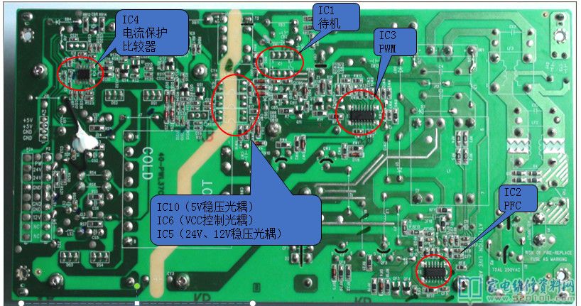 当电源板收到的PS-ON信号是低电平的时候,QS3的BE极因没有足够电压导通,此时QS3处于截至状态,因此光耦IC6无法工作,因此VC电压无法通过Q11,因此也无法提供VCC2和VCC1的电压,因此机器的PFC和PWM无法工作,就没有12V和24V电压输出。