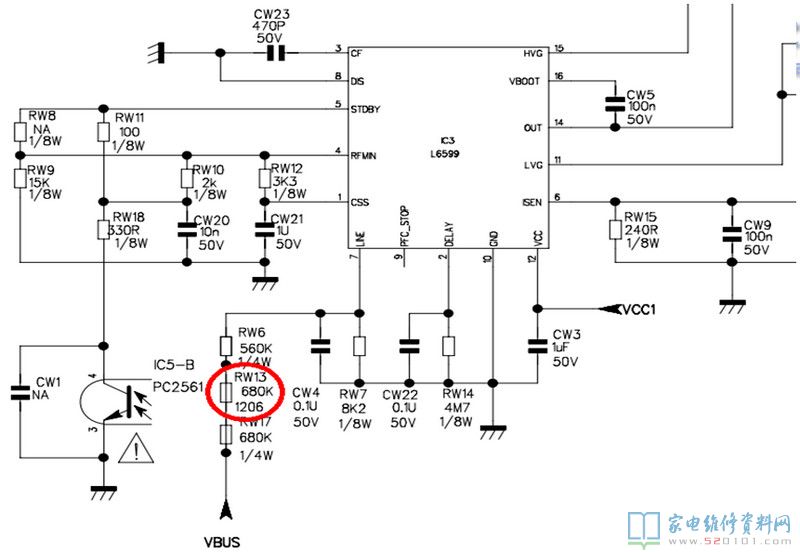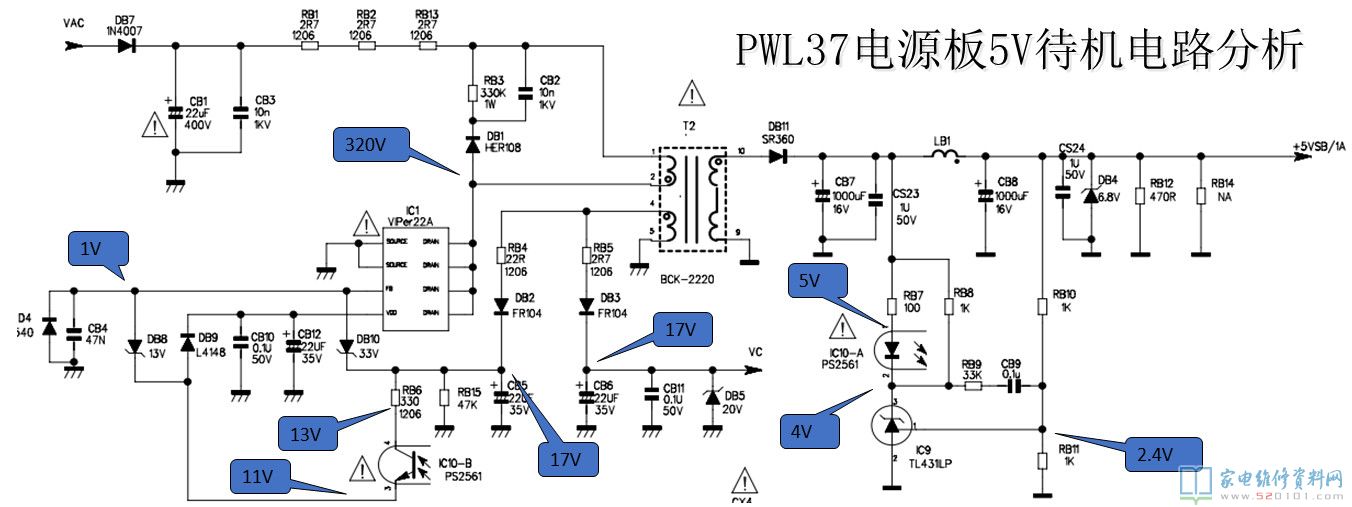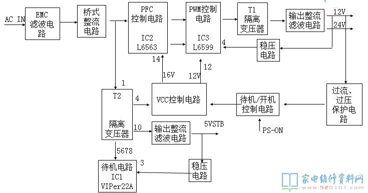 320V的直流经过DB7、RB3、RB2、RB13后接到变压器T2的初级绕组的1脚,其中2脚接到IC1的5、6、7、8脚、由IC1内部的启动电路连接到4脚的VDD,使IC1的源、漏极接通,从而使变压器的T1的初级绕组接通,感应次极绕组的10脚输出经DB11整流的5V的待机电压。RB10取样5V电压,连接到光耦IC10通过控制流过光耦IC10的1、2脚的电流,改变光耦3、4脚的阻抗,并反馈到IC1的第3脚,对IC1的输出控制,从而使变压器输出,得到稳定的5V。 同时,变压器T1的次极绕组4脚分两路输出:1.一路经过DB3整流后输出17V分别给PFC功能模块的IC*IC2和PWM电路的IC*IC3提供工作电压。2.一路经过DB2整流后给IC1本身提供供电。
