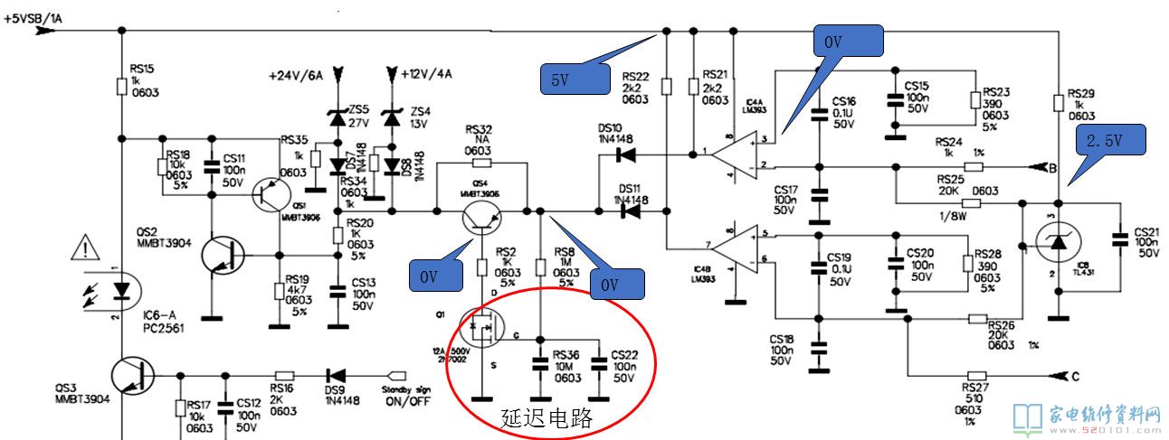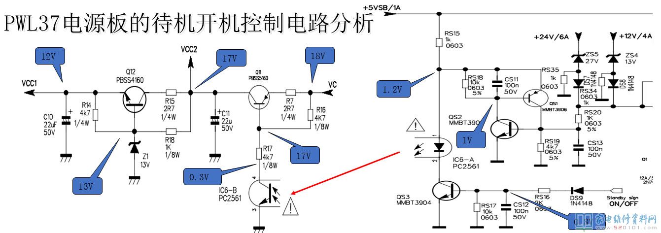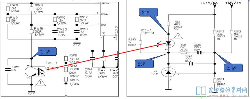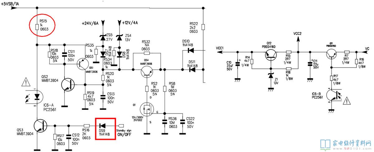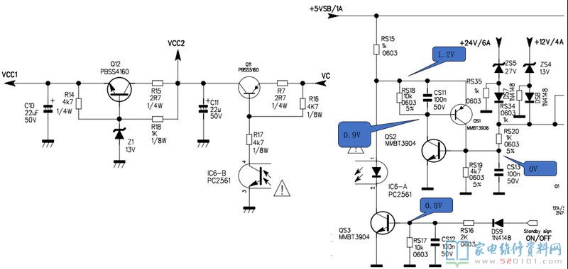 正常工作的时候:QS1和QS2处于截至状态,不影响光耦的工作。当24V或和12V出现过压时,稳压二极管ZS5或ZS4导通,电压经过RS20加到QS2的B极,使QS2进入饱和导通状态,同时QS1也会进入饱和导通状态,将光耦的1脚电压拉低,此时光耦IC6停止工作,光耦次级呈现较大阻抗,Q11截止,无法产生PFC和PWM电路的供电电压VCC2和VCC1,机器进入待机状态。