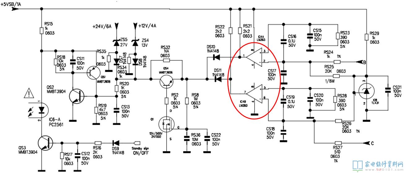 方法:开机瞬间有12V、24V电压,慢慢下降至0V,这种现象有可能是保护或电源带不起负载造成。测滤波电容C5为300V ,说明PFC电路没有工作,测IC2(L6563)14脚供电电压也是慢慢下降。断开过压过流保护电路RS20时,输出电压正常,说明故障在过压过流电路,经进一步检查测量,发现是IC4 LM393电流比较器损坏。
