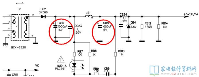 方法:测待机5V电压低(4V左右),经查是待机滤波电容CB7或CB8损坏,此种故障空载时5V正常,带负载后5V电压低(修理时5V待机电路故障是容易忽视的地方)。