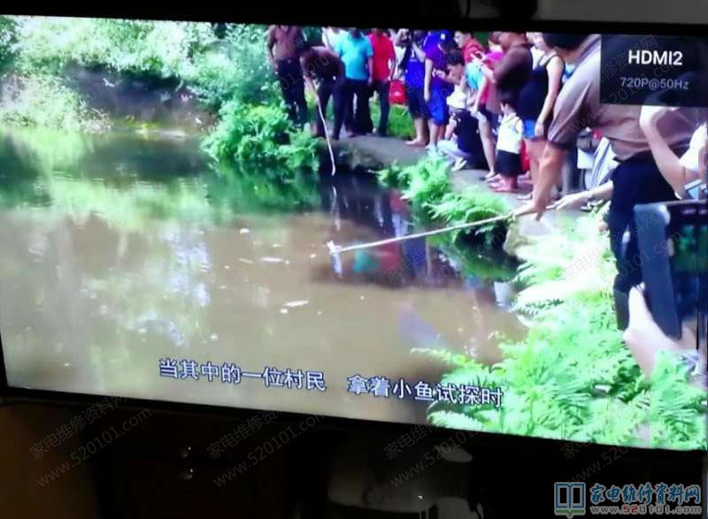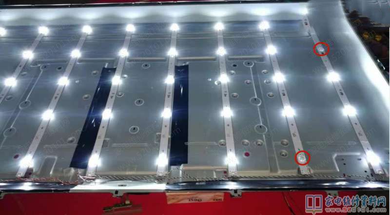 一客户说他家前几年网购的一台TCL D55A710液晶电视使用了三年多一点,就出现了灯条故障。故障现象是开机一分多钟之后图像一下暗一下亮,开机正常时候发现右上角和下方右有黑斑,判断为灯条故障。拆卸电视机后通电试机,测试果然坏了两颗灯珠。