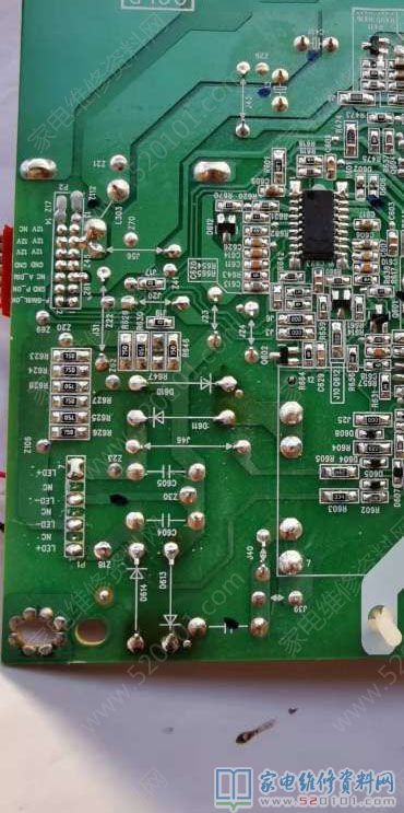打开后盖,检查背光部分。该机背光控制集成电路是BD9211F,背光灯条共8条、每条4灯、每灯6.3V,每4条串联成一组,共2组。先检查这两组电压发现一组是77V、另一组是69V,显然不正常。因为4条一组是16灯,每灯6.3V计,应是6.3*16=100.8V才对,拆开屏幕,果然发现有多颗灯击穿不亮,更换全新灯条,试机测得两组电压分别是102V和101V。试机数小时再也没有出现图像消失现象,故障完美修复。
