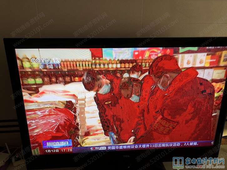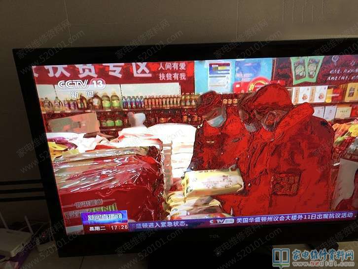 接修一台TCL L46F11液晶电视,客户反应故障现象是不定时发红(图下图所示),更换逻辑板故障依旧,逻辑板是拆机的,清洗擦拭LVDS线金手指与逻辑版两个排线金手指故障依旧,最后把LVDS排插位置补焊,把排插的位置的的胶清理了之后故障修复,试机数小时没有发现有红屏的现象。