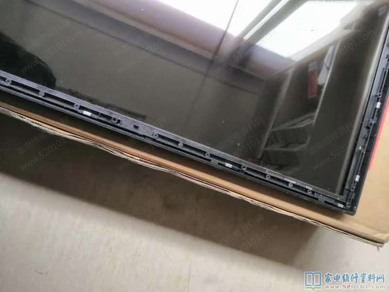 结果自己都吓了一跳,事后回想,当时如果不谨慎,肯定是翻车了,如下图所示,由于显示屏玻璃板和边框是连在一起的,要想分解,必须反过来从里面把卡扣去掉才可以单独拿出玻璃板,和一般的液晶屏拆卸不一样,当时刚拆开的时候,靠电视下部的反光板边框或者支撑液晶屏下半部分的横框直接就跟着拿出来了,当时心里就犯嘀咕,搞不清楚咋回事,脑子嗡嗡的,只有电视液晶屏朝下,直接把外壳拿出来了,这时候才发现这个液晶屏是根本直接取不出来的,有卡扣从里面卡死的。